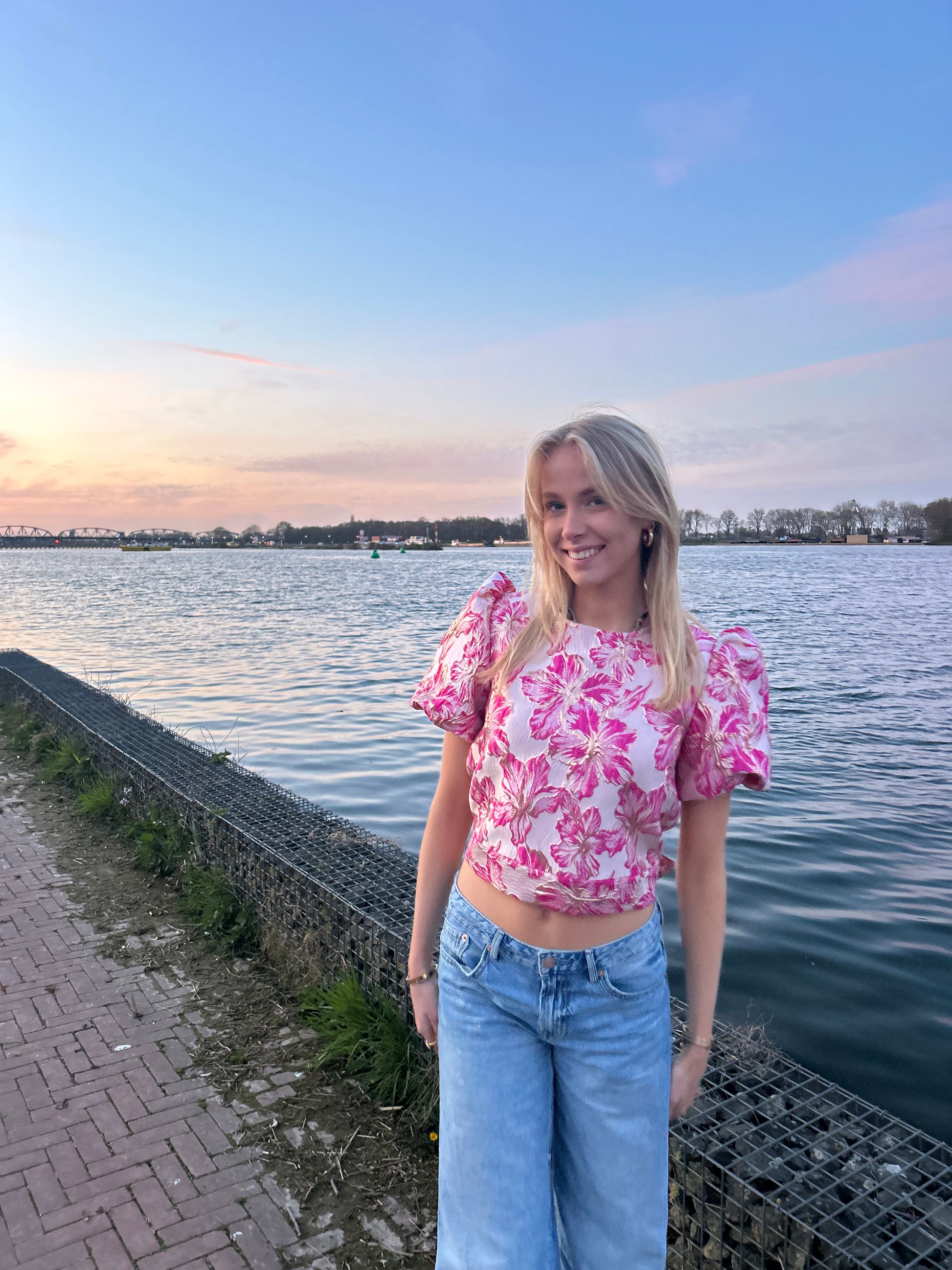 De Vera top is een blouse met pofmouwen, een getailleerde pasvorm en een open rug die je strikt met linten. Ook verkrijgbaar in Light Pink en Light Blue, beide met een subtiel bloemenpatroon en gouden accenten.